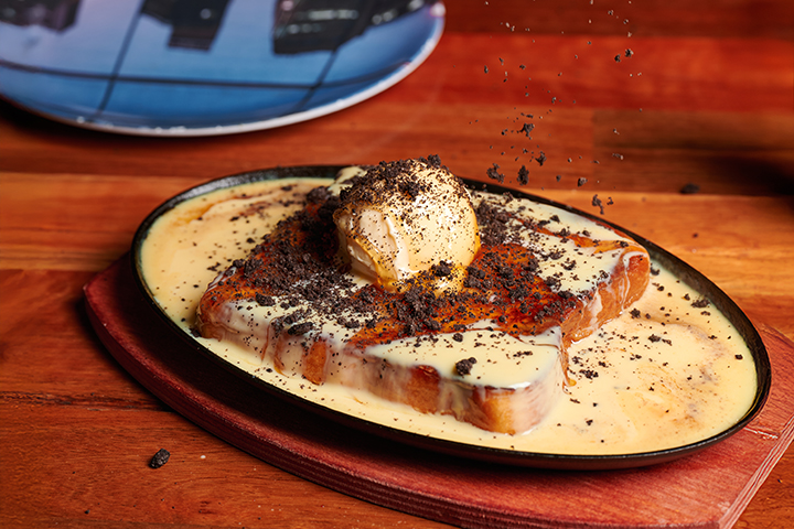 Thick, fluffy slices of Japanese French toast served on a sizzling plate with a scoop of vanilla ice cream. Topped tableside with vanilla custard, honey drizzle and crushed Oreo crumbs.